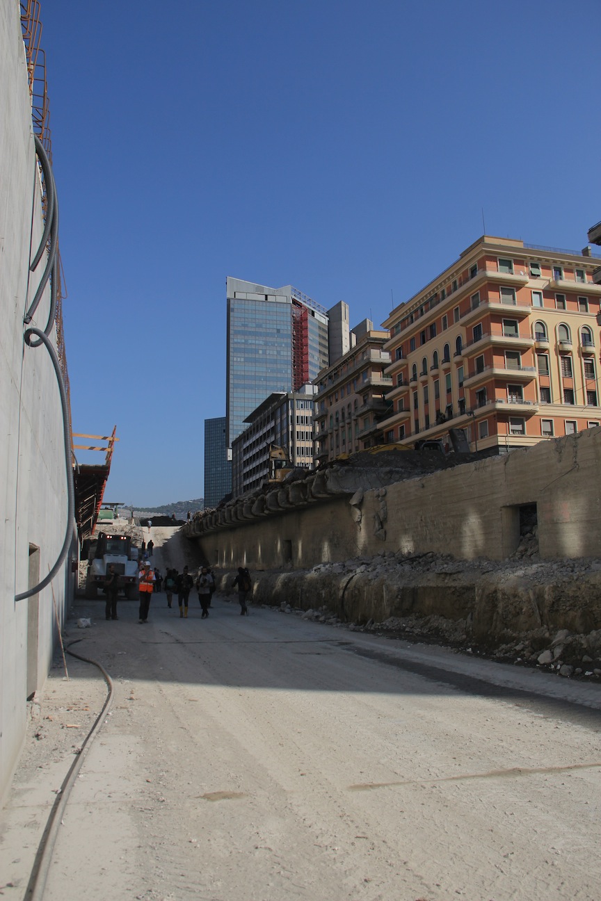 La visita inizia da uno dei luoghi simbolo delle scorse alluvioni genovesi: l’alveo del Bisagno all’altezza di Borgo Incrociati, zona conclusiva del terzo lotto ma, in generale, di tutti i lavori di rifacimento della copertura del torrente che sono partiti dalla foce per risalire fino alla zona della stazione Brignole.