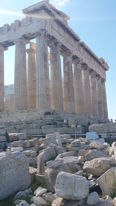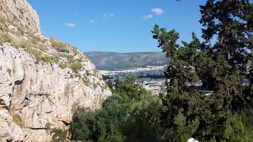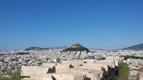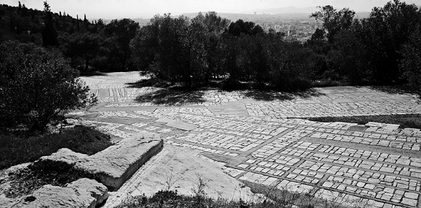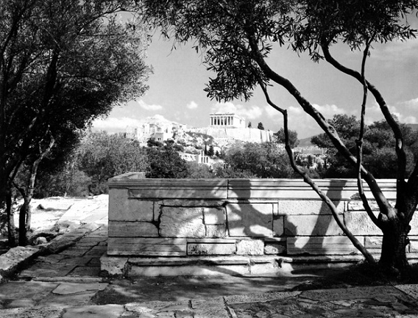 Dall’alto e sotto un cielo blu cobalto si domina la città che si stende ai piedi dell’Acropoli, lontana fisicamente e mentalmente, bianca e verde. Questi soli tre colori puri dominano tutto il paesaggio che si estende fino al mare in lontananza. Evidente è la discrasia tra disordine della parte moderna della metropoli ed il perfetto equilibrio di quella antica, il contrasto tra costruito e natura.