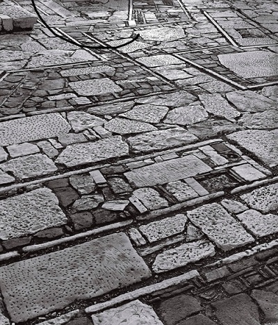 Le pavimentazioni sono la chiave di lettura: il detrito storico riceve la stessa attenzione dell’antico monumento divenendo strumento di sintesi tra storia e contemporaneità. Pochi i disegni preparatori, ogni pietra era scelta e posizionata in cantiere come meglio poteva adattarsi alle esigenze del terreno. Il riutilizzo di pietre scolpite, marmi, capitelli e terracotte è antica abitudine vernacolare quando nulla può essere sprecato. Qui nasce un progetto di paesaggio moderno, così ben integrato con il contesto da apparire come se lì fosse sempre stato.