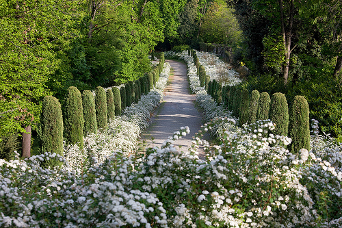 Vi sono pini marittimi, prostrati e piegati dal vento, antichi platani, qualche cipresso che “verticalizza” gli spazi e lecci che uniscono alla nobiltà delle querce (famiglia cui appartengono) i toni grigi e scuri delle foglie. Proprio grazie a tutto questo, i colori chiari delle pietre e del marmo degli edifici vengono, a contrasto, enfatizzati. L’insieme della vegetazione fa da sfondo a statue e colonnati, in un sapiente gioco chiaroscurale che accentua l’aspetto storico del contesto.